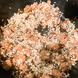 On medium high heat, cook onions in butter. When they are translucent, add the garlic and sausage. Brown the meat, and add the mushrooms. To deglaze the pan, add 1/4 to 1/2 cup of white wine. This is optional. You can use some broth if you prefer, but the wine does had some dimension to the dish. Once the wine evaporates, add the rice to the pot. Brown the rice a little bit. Start adding the broth. Add one cup of broth at a time. This will take some time, but this is what makes risotto instead of just rice. You stir until all the broth is absorbed and then you add another cup. You will do this until you have added all 8 cups of broth. When all the broth is absorbed, the rice will be so creamy, and your arms will be tired. Add the parmesan at the this point and serve immediately.